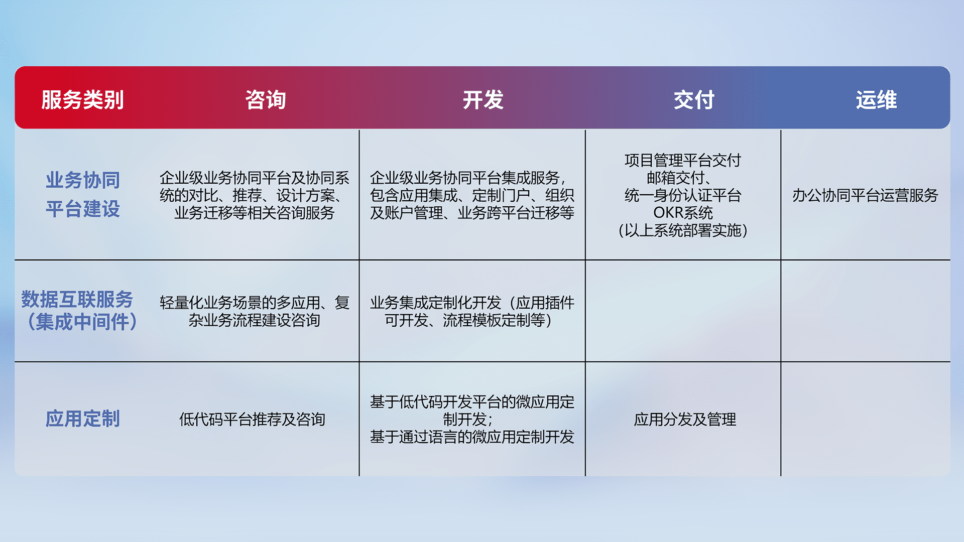 针对钉钉、、企微、、IDaas等平台级产品提供产品的规划、、、、方案、、、、交付、、、、定制化开发等服务,,实现如统一协同办公、、智能客户服务、、、、混合会议管理、、智能数据查询、、等业务场景,,实现数字化转型。。